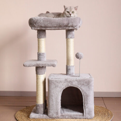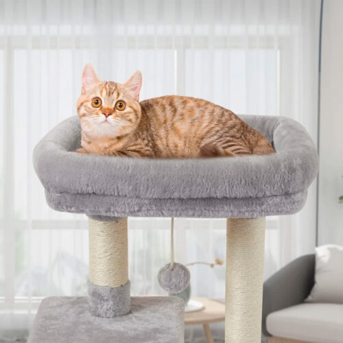 La base del condominio es robusta y estable, mientras que las plataformas del segundo y tercer nivel ofrecen un espacio amplio para que tu gato observe el entorno desde las alturas, sintiéndose como un verdadero rey o reina.