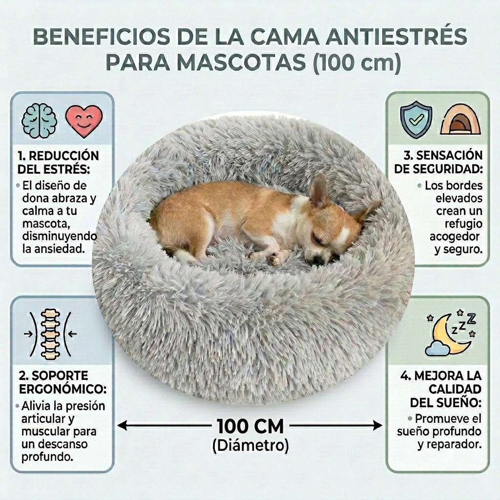 La cama dona Beepaw de 100 cm está diseñada para brindar un descanso cómodo, cálido y seguro para tu mascota. Su forma envolvente y su superficie de terciopelo largo generan una sensación de contención ideal para uso diario en interiores.
