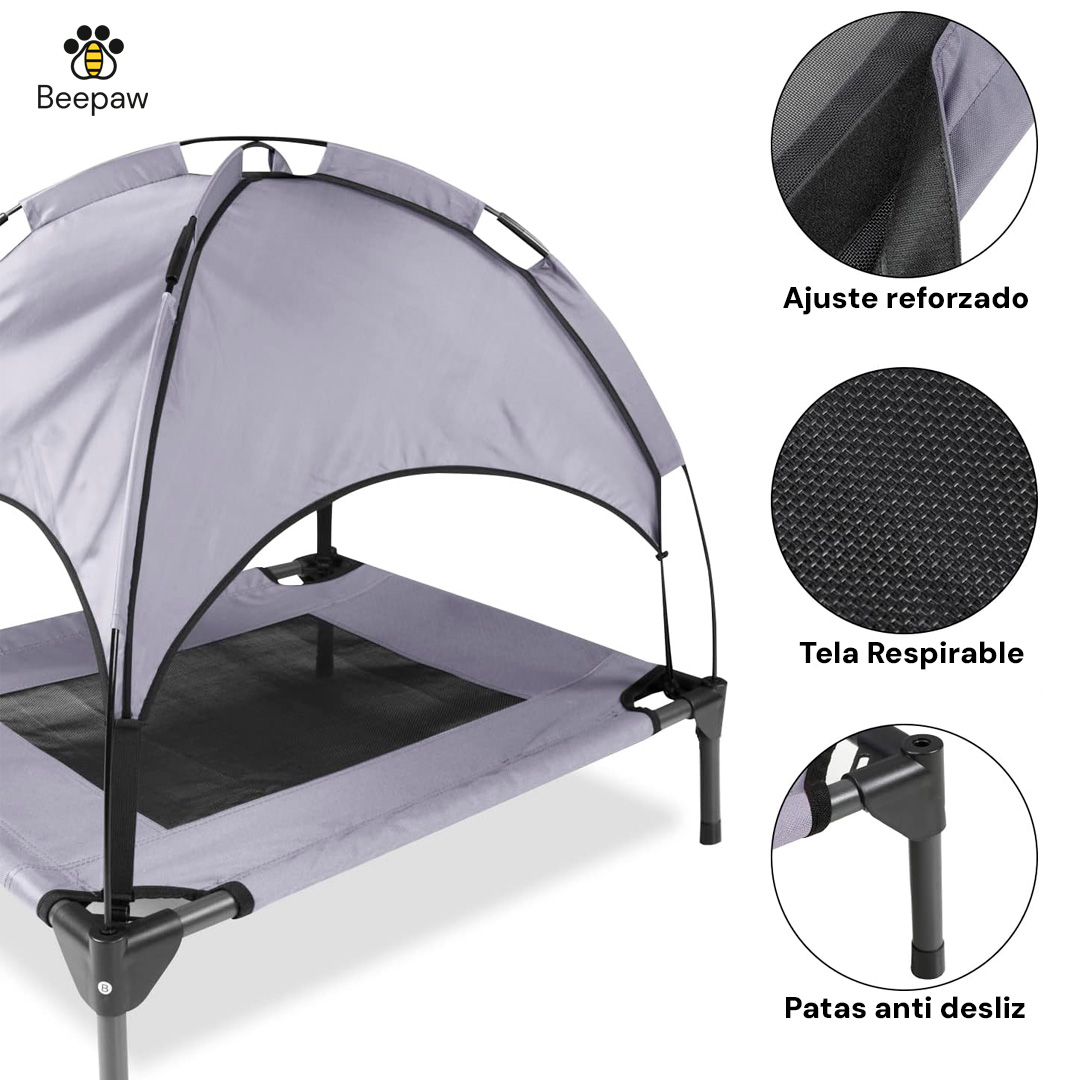 Dale a tu mascota el máximo confort y protección con esta cama elevada con dosel, ideal para usar tanto en interiores como en exteriores. Su diseño innovador mantiene a tu perro o gato fresco, limpio y protegido del sol y la humedad.
