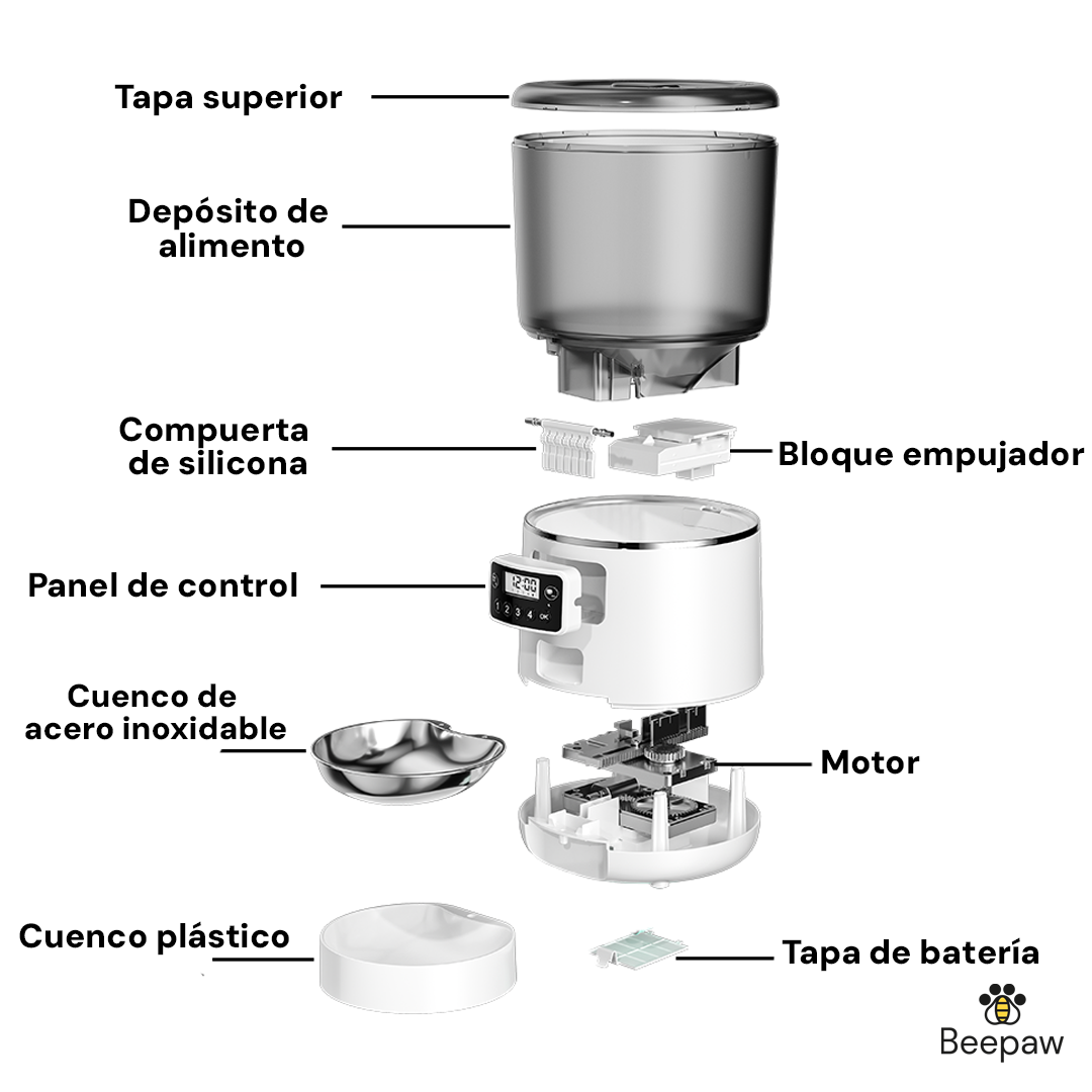 - Capacidad máxima: 4 L (aprox. 3 kg de alimento seco)