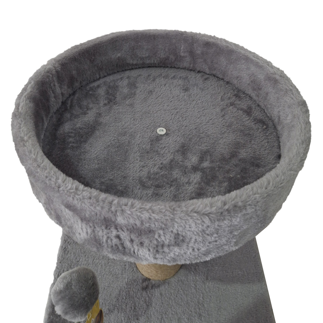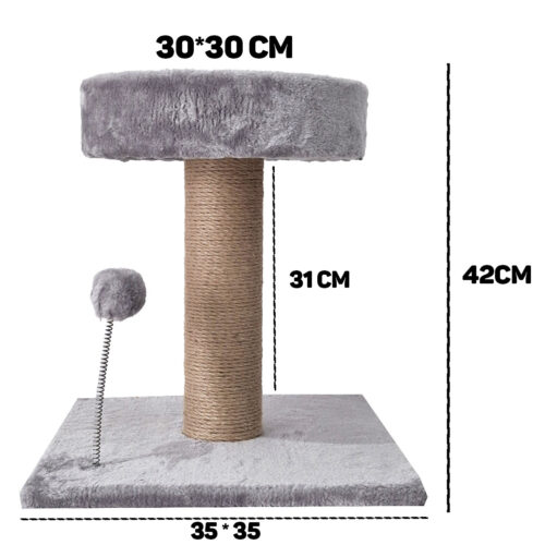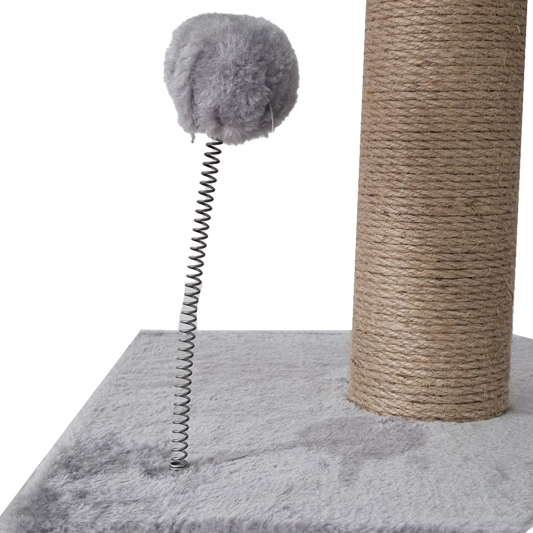Este rascador está fabricado con materiales de alta calidad: tablero de partículas de 1,2 cm, felpa suave de 300g y poste envuelto en resistente yute de 3 mm. Incluye un tubo de papel de 7,8 cm de diámetro y una base estable recubierta en terciopelo. Además, cuenta con una divertida pelota con resorte para estimular el juego.